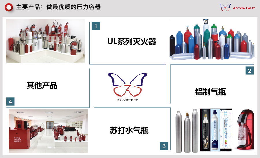 公司专业生产各类气瓶,用于二氧化碳饮料,潜水,特种气体,医疗,消防,彩弹,农业等行业,以及生产消防阀门、气瓶阀门、手提式灭火器、推车灭火器、卷盘和水系统等产品。