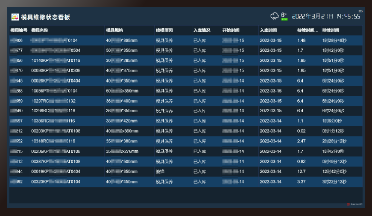 在模具库区架设电子看板-模具保养,推送模具状态、工作量、保养、寿命等重要信息,指导工艺人员日常及维护工作开展。