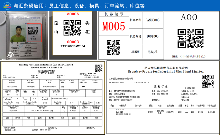 海汇目前扫码的应用比较广:员工信息二维码扫码上工、模具码、机器设备码、业务订单、车间计划流转、库位等,均已实现扫码流转管理。