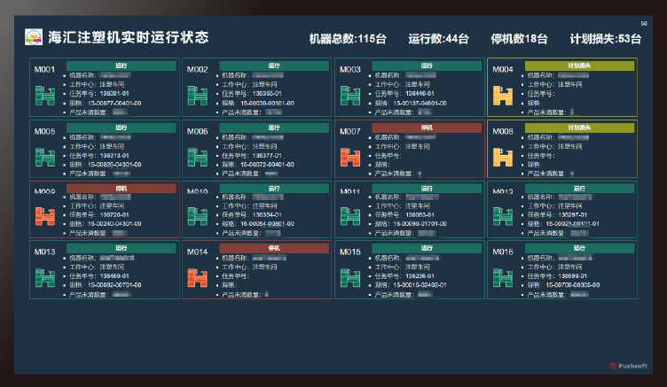 现场架设电子看板-机器监测预警,实时推送设备的运行情况:运行状态、任务单、产品信息、计划数、未清数等。