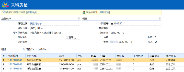供应商来料时,经仓管员点收,核对物料的规格、数量相符后给予签收。仓管员通过移动采集设备PDA扫描供应商标签,登记重要信息,生成“采购收货单”,再交质量部进行IQC检验及质量判定。