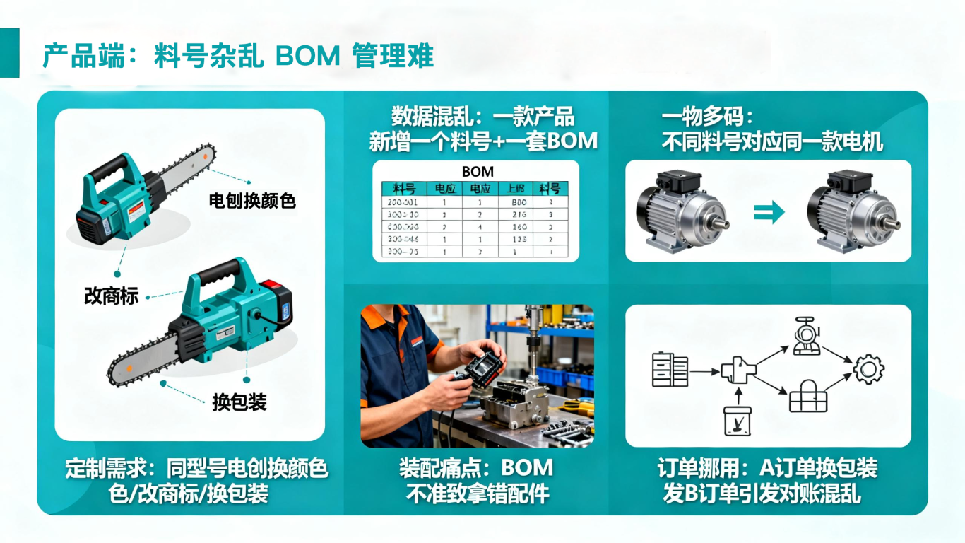 BOM 断阶指导:不盲目新增料号,比如同一款电刨的不同颜色,靠 “工序管控”(装配时贴不同颜色标签)替代新料号,减少数据量15%;