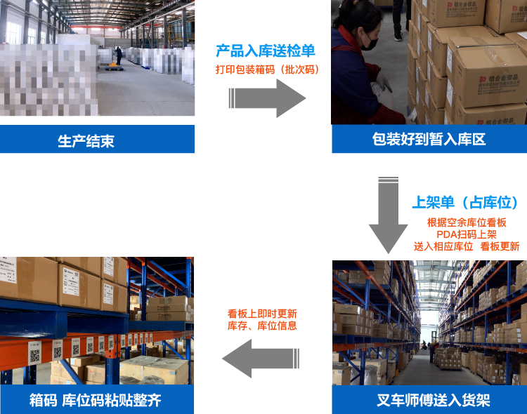 铸造件的客户对产品表面要求比较高,所以产品生产结束下生产线就得包装,系统中制作产品入库送检单,同时打印出包装箱的标签粘贴到箱上,包装好后 PDA扫码清点过数,叉车师傅给叉到待入库区。查看空余库位看板,扫箱码上架。