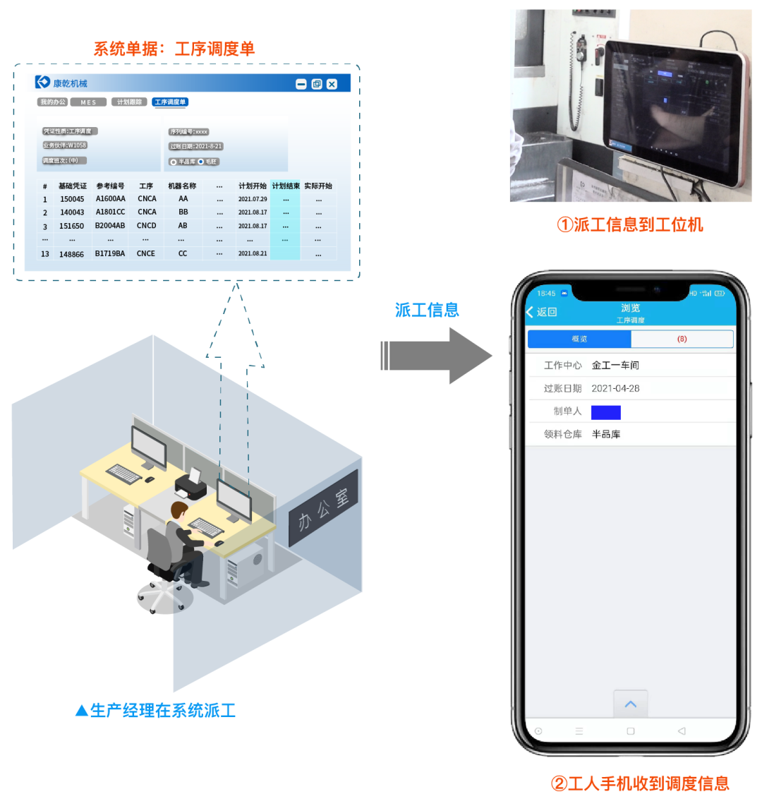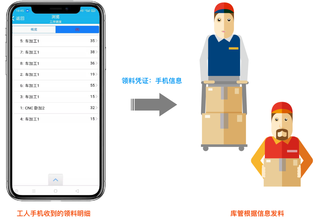 由生产经理统一在系统里面做调度单,并下发信息到相关人员手机,收到信息,凭着信息去领料,领料后在工位机上加载任务开始生产。