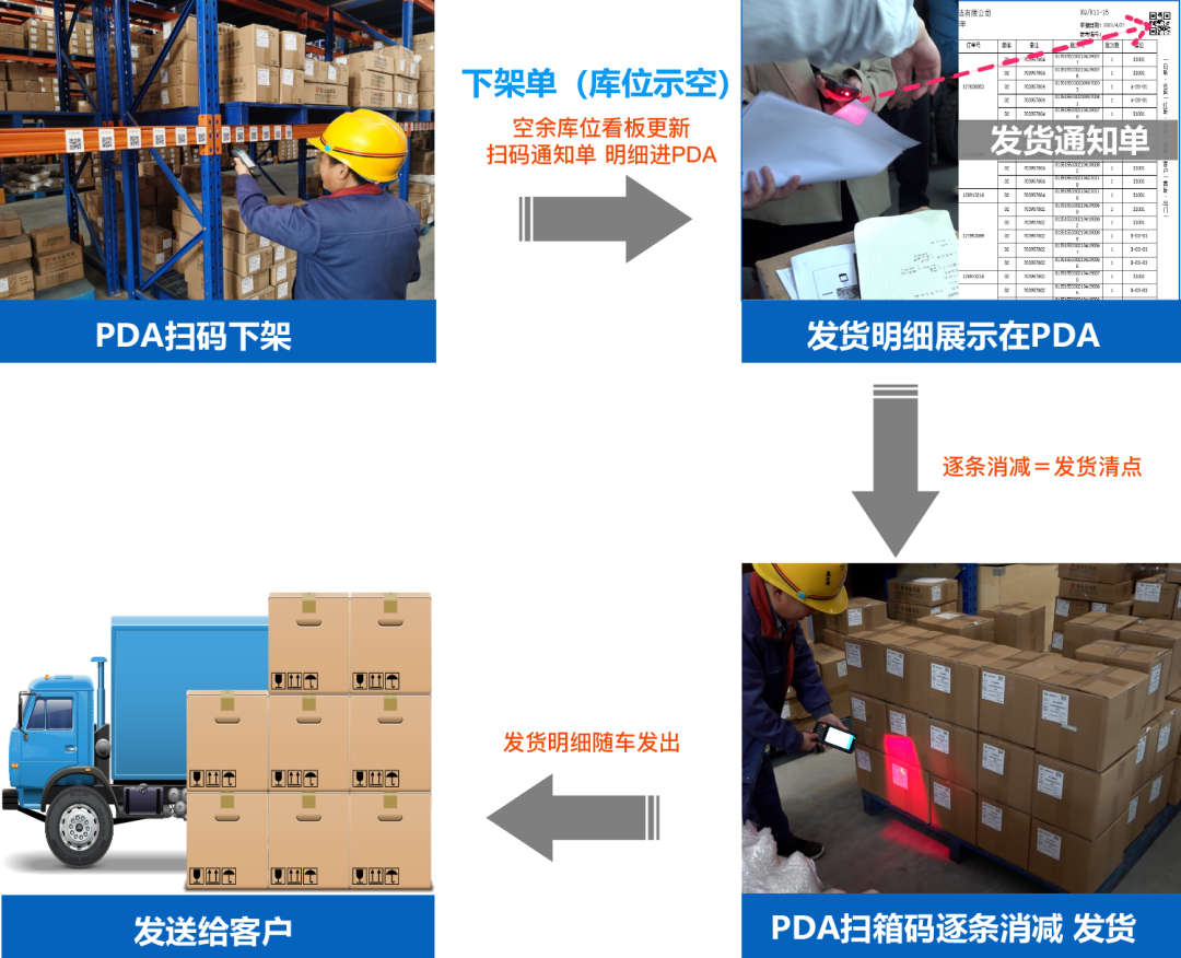 仓库人员扫库位码与箱码生成一张下架单,库位示空。然后再扫描发货通知单上的二维码将发货明细代入PDA,并将货物装托,最后PDA扫描箱码逐条抵消,直到PDA上明细全部消除则完成出库发货。