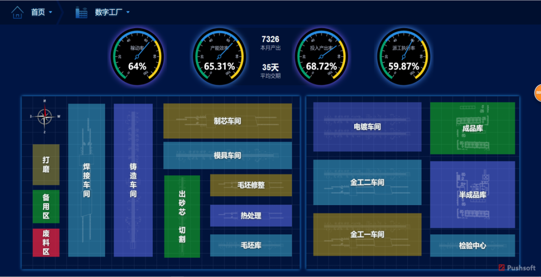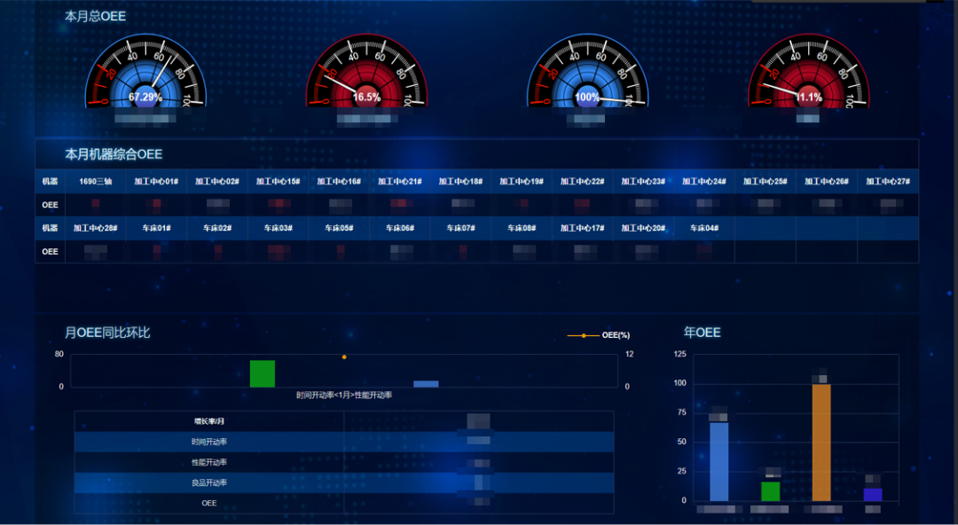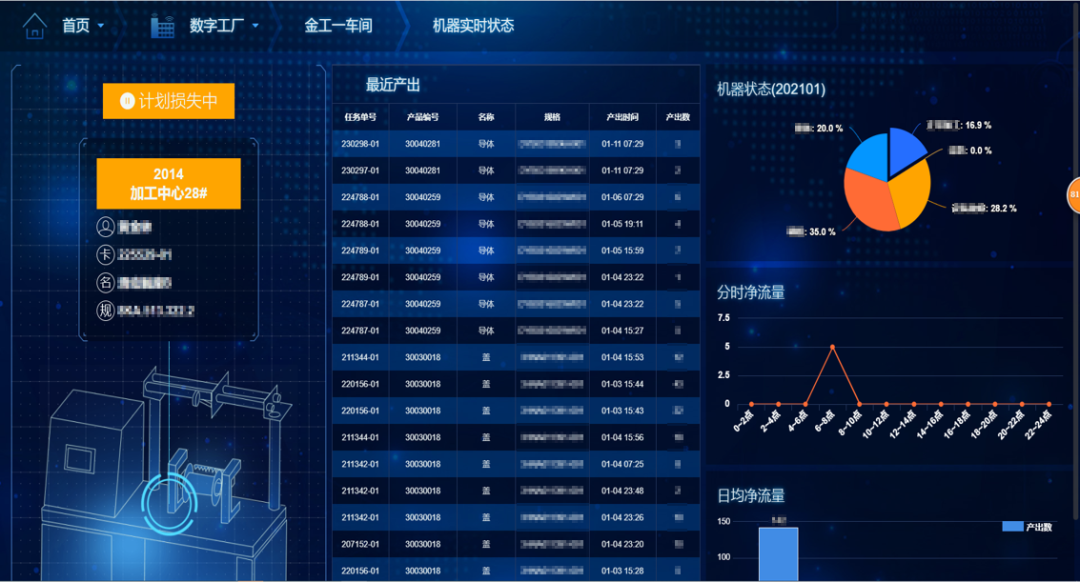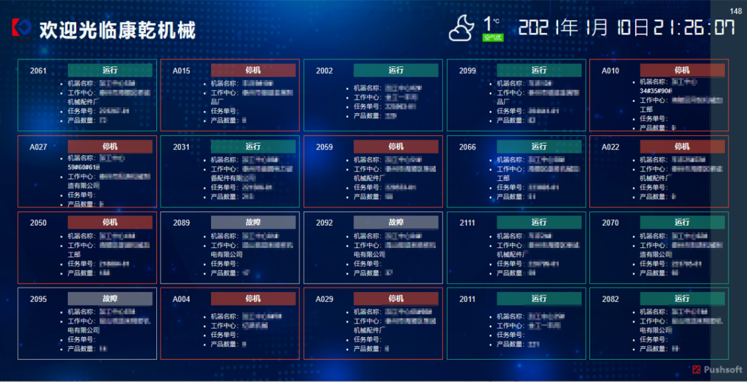2、一个画面内看到所有机床设备的运行状况(运行,故障停止,计划缺失),生产任务单信息,订单未清等;