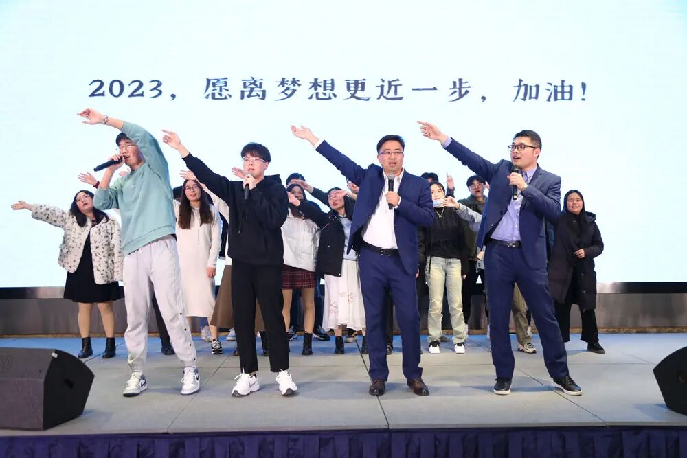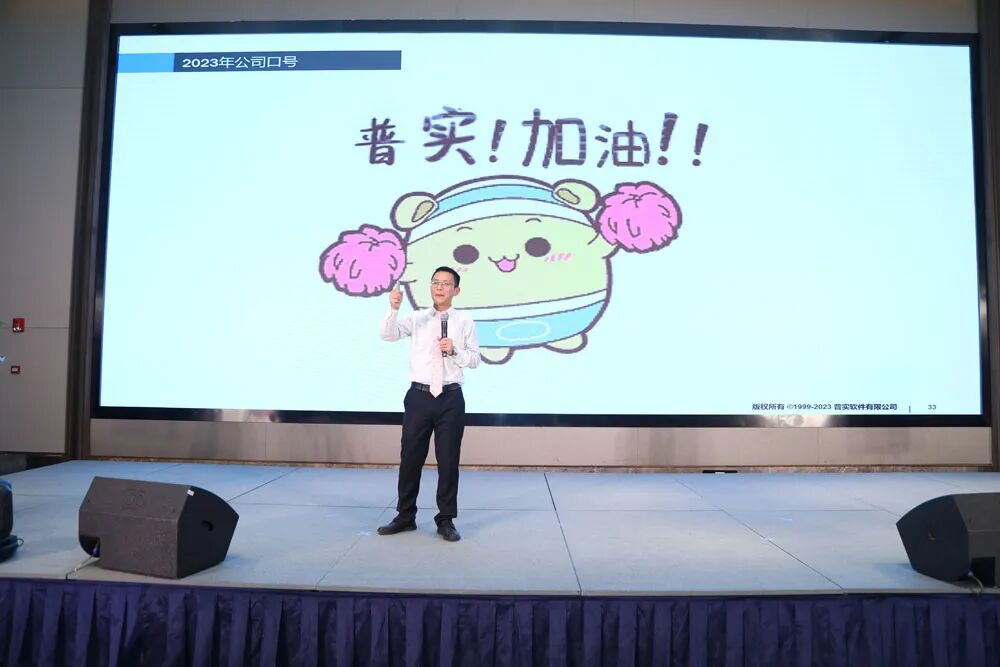 然后是寄语明年的工作和生活,普实2023年将以第三次创业的心态和奋发,进行技术、实施和业务工作的重组:业务将推动月费制改革,实施将重点推动2-3,7-8的工作,技术落实一体化+行业化+KPI的应用,真正让我们自身变得值钱,而这才是普实在市场上最大的竞争力。今年朱总也重拾四年前增长最快时的口号“普实!加油!”